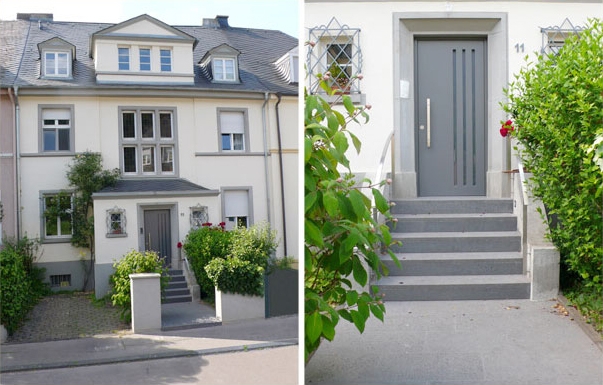Usiicht vum Haus mat nei aménagéierter Entrée Dir mat Trap an Handlaf
